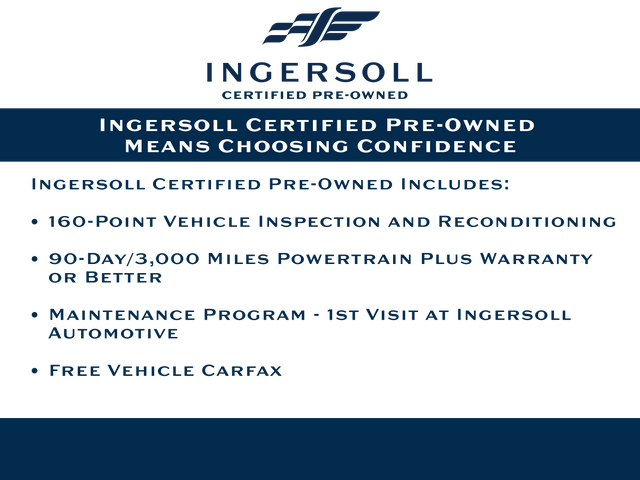 Certification Program Details: This vehicle is being sold as Ingersoll Certified Pre-Owned. This program gives you piece of mind. You will receive. **A Vehicle Inspection and Reconditioning Form. **A Vehicle Carfax. **90 Days or 4000 miles of Powertrain Plus Limited Coverage **A Free Maintenance event including oil change and tire rotation within the first 12mo or 12,000 miles of driving (at an Ingersoll Automotive Location) This is not a manufacturer sponsored program.