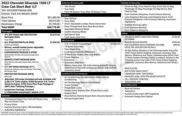 10-Way Power Driver Seat w/Lumbar, 12.3 Multicolor Reconfigurable Digital Display, 120-Volt Instrument Panel Power Outlet, 6-Speaker Audio System, All Star Edition Plus, All-Weather Floor Liner (LPO) (AAK), Auto High-beam Headlights, Auto-Locking Rear Differential, Chevytec Spray-On Black Bedliner, Convenience Package, Convenience Package II, Dual Rear USB Ports (Charge Only), Dual-Zone Automatic Climate Control, Heated Driver & Front Outboard Passenger Seats, Heated Steering Wheel, Hitch Guidance w/Hitch View, Integrated Trailer Brake Controller, IntelliBeam Automatic High Beam On/Off, Keyless Open & Start, Leather Wrapped Steering Wheel, Manual Tilt/Telescoping Steering Column, Power Sliding Rear Window w/Rear Defogger, Protection Package, Radio: Chevrolet Infotainment 3 Premium System, Rear Wheelhouse Liners, Remote Start Package, Remote Vehicle Starter System, Trailering App, Universal Home Remote, Wheels: 20 x 9 Painted Aluminum, Wireless Phone Projection, Z71 Off-Road & Protection Package, Z71 Off-Road Package.