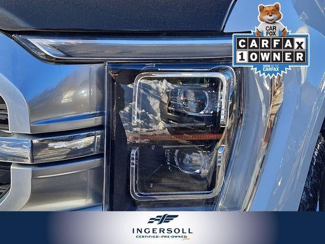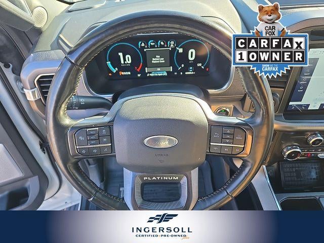 The exterior of this F-150 Platinum exudes a bold and refined presence with its Star White Metallic Tri-Coat paint and striking 20-inch polished aluminum wheels. The FX4 Off-Road Package adds rugged capability, with features like off-road tuned shock absorbers, skid plates, and rock crawl mode, ensuring you can tackle any terrain with confidence.
