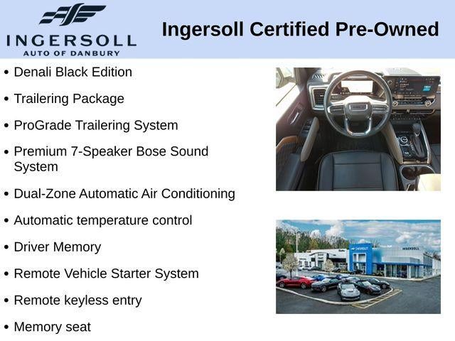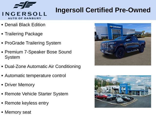The Canyon Denali's bold, distinctive styling commands attention on the road. With its sleek black exterior and chrome accents, this truck exudes a refined and confident presence. Step inside the well-appointed cabin, and you'll be surrounded by premium materials, including genuine wood and leather-appointed seating.