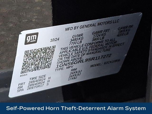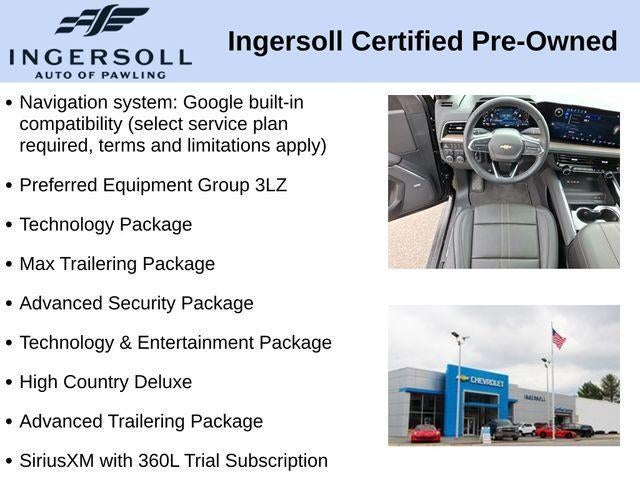 15 Diagonal Multi-Color Head-Up Display, 2-Speed Active Electronic AutoTrac Transfer Case, 3rd Row 60/40 Power-Folding Split-Bench, 4-Way Power Driver Lumbar Seat Adjuster, 4-Way Power Front Passenger Lumbar Seat Adjuster, 8-Way Power Front Passenger Seat Adjuster, Advanced Security Package, Advanced Trailering Package, Air Ride Adaptive Suspension, Apple CarPlay/Android Auto, Auto High-beam Headlights, Blind Zone Steering Assist with Trailering, Bose 10-Speaker Surround with CenterPoint, Bright Front and Rear Door Sill Plates, Chrome Door Handles with Body-Color Strip, Dual Exhaust System, Dual-Pane Power Panoramic Sunroof, Exterior Parking Camera Rear, Front LED Fog Lamps, Glass Breakage Sensor, Heated 2nd Row Outboard Seats, Heated Driver and Front Passenger Seats, Heated Power-Adjustable Outside Mirrors, Heated Steering Wheel, High Country Deluxe, Hitch View with Pan/Zoom Image Adjustment, Inside Rearview Auo-Dimming Rear Camera Mirror, LED Headlamps with LED Daytime Running Lamps, LED Tail Lamps, Magnetic Ride Control Suspension, Max Trailering Package, Memory Settings, Navigation system: Google built-in compatibility (select service plan required, terms and limitations apply), Perforated Heated and Ventilated Seats, Power Release 2nd Row Bucket Seats, Power steering, Power Tilt and Telescopic Steering Column, Power-Retractable Assist Steps, Power-Sliding Center Floor Console, Preferred Equipment Group 3LZ, Radio: 17.7 Diagonal Advanced Color LCD Display, Rain sensing wipers, Rear Power Liftgate, Rear Seat Media System, Self-Powered Horn Theft-Deterrent Alarm System, SiriusXM with 360L Trial Subscription, Smart Trailer Integration Indicator, Technology & Entertainment Package, Technology Package, Universal Home Remote, Vehicle Inclination Sensor, Vehicle Interior Movement Sensor, Wheels: 22 x 9 Bright Machined Aluminum, Wireless Apple CarPlay/Wireless Android Auto, Wireless Phone Charging.