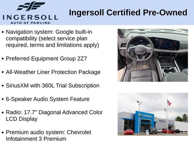 1st and 2nd Row Color-Keyed Carpeted Floor Mats, 1st and 2nd Rows All-Weather Floor Liners, 2-Speed Active Electronic AutoTrac Transfer Case, 3-Spoke Wrapped Steering Wheel, 3rd Row All-Weather Floor Liners, 3rd Row Manual 60/40 Split-Folding Bench Seats, 6-Speaker Audio System Feature, 8-Way Power Driver Seat Adjuster, 8-Way Power Front Passenger Seat Adjuster, All-Weather Cargo Mat, All-Weather Liner Protection Package, Apple CarPlay/Android Auto, Auto High-beam Headlights, Auto-Dimming Inside Rear-View Mirror, Black Tubular Assist Steps, Bright Front and Rear Door Sill Plates, Color-Keyed Carpeting Floor Covering, Dual Exhaust System, Exterior Parking Camera Rear, Floor Console with Storage Area, Front Bucket Seats, Front High-Approach Angle Fascia, Front LED Fog Lamps, Front Pedestrian and Bicyclist Braking, Frontal Driver and Outboard Passenger Airbags, Fully automatic headlights, Heated Driver and Front Passenger Seats, Hill Descent Control, Memory seat, Memory Settings For Driver, Navigation system: Google built-in compatibility (select service plan required, terms and limitations apply), Preferred Equipment Group 2Z7, Premium audio system: Chevrolet Infotainment 3 Premium, Radio: 17.7 Diagonal Advanced Color LCD Display, Rain sensing wipers, Rear Power Liftgate, Red Horizontal-Mounted Recovery Hooks, Remote Start, SiriusXM with 360L Trial Subscription, Universal Home Remote, USB Ports, Wheels: 20 x 9 Bright Machined Aluminum, Wireless Phone Charging, Z71 Exterior Features.